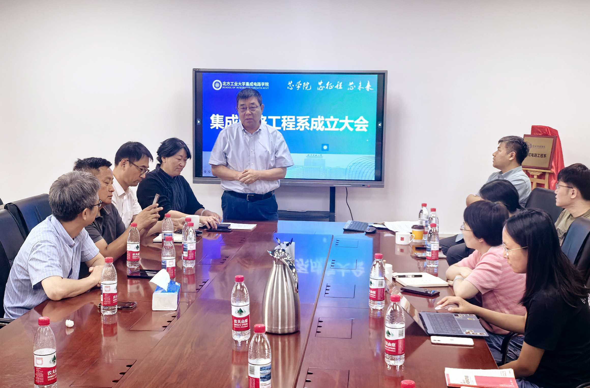 会议伊始,党总支副书记陈卫宣读了公司关于成立集成电路工程系的决定,并宣布聘任吴斌教授担任首任系主任。随后,吴斌教授发表就职讲话,围绕教学与科研两大方向,对集成电路工程系的未来发展提出设想与规划。他表示,新系将充分整合校内多学科优势资源,聚焦先进芯片设计、EDA工具及集成系统等核心领域,着力构建产教融合、协同育人的新型人才培养模式。
