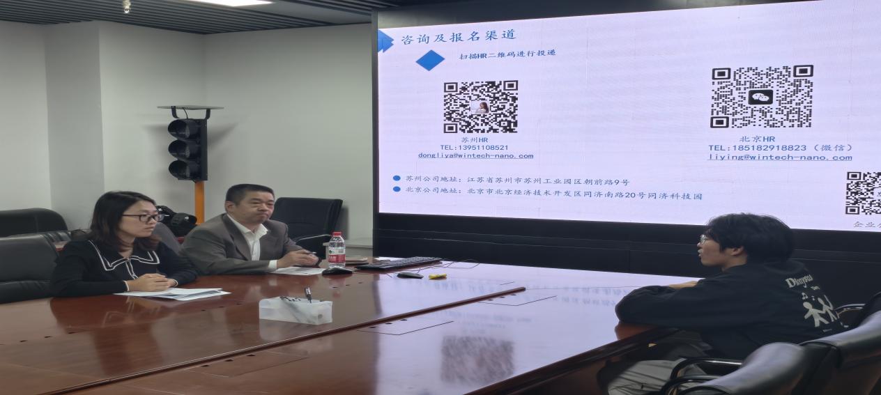 胜科纳米科技(北京)有限公司常务副总经理乔明胜介绍了公司的相关情况、主营业务、核心竞争力以及行业优势,并且围绕招聘岗位和薪资待遇和员工展开了具体的讨论。介绍结束,部分员工提交简历并开启现场面试。