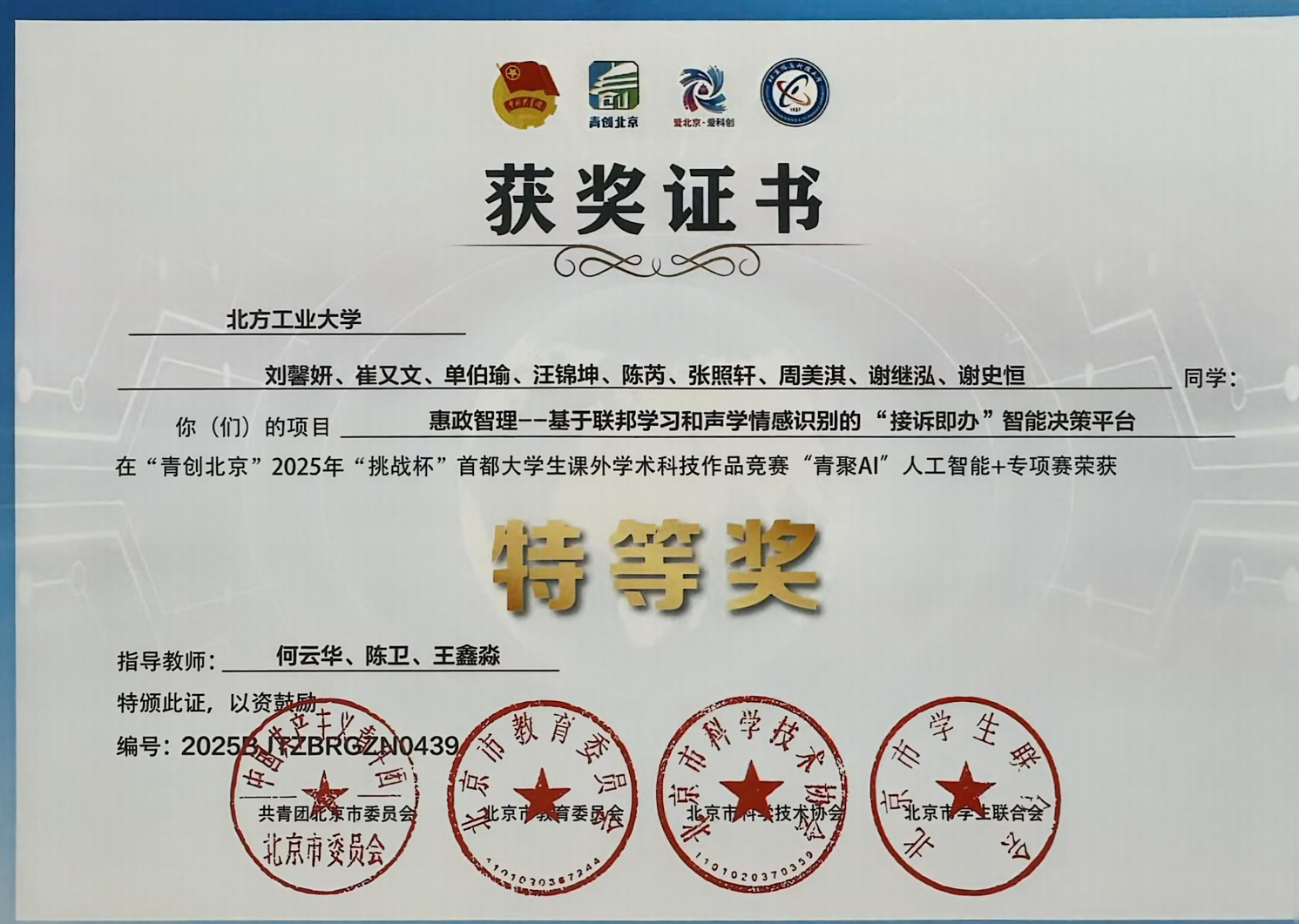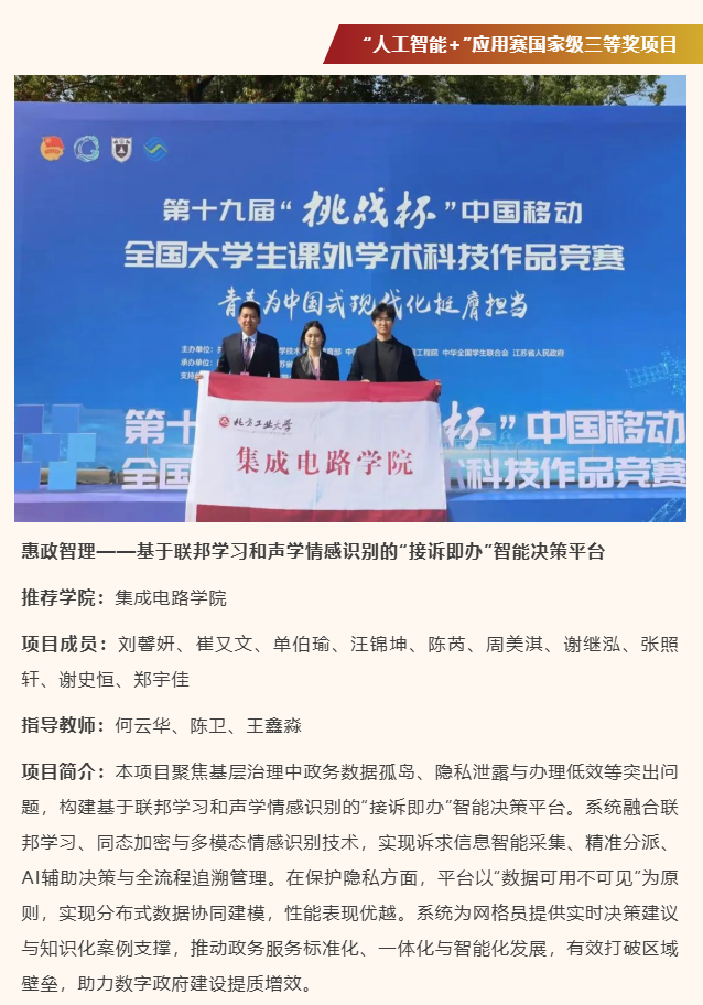 利来国际优秀学子获得“青创北京”2025年“挑战杯”首都老员工课外学术科技作品竞赛“青聚AI”人工智能+专项赛,特等奖1项: